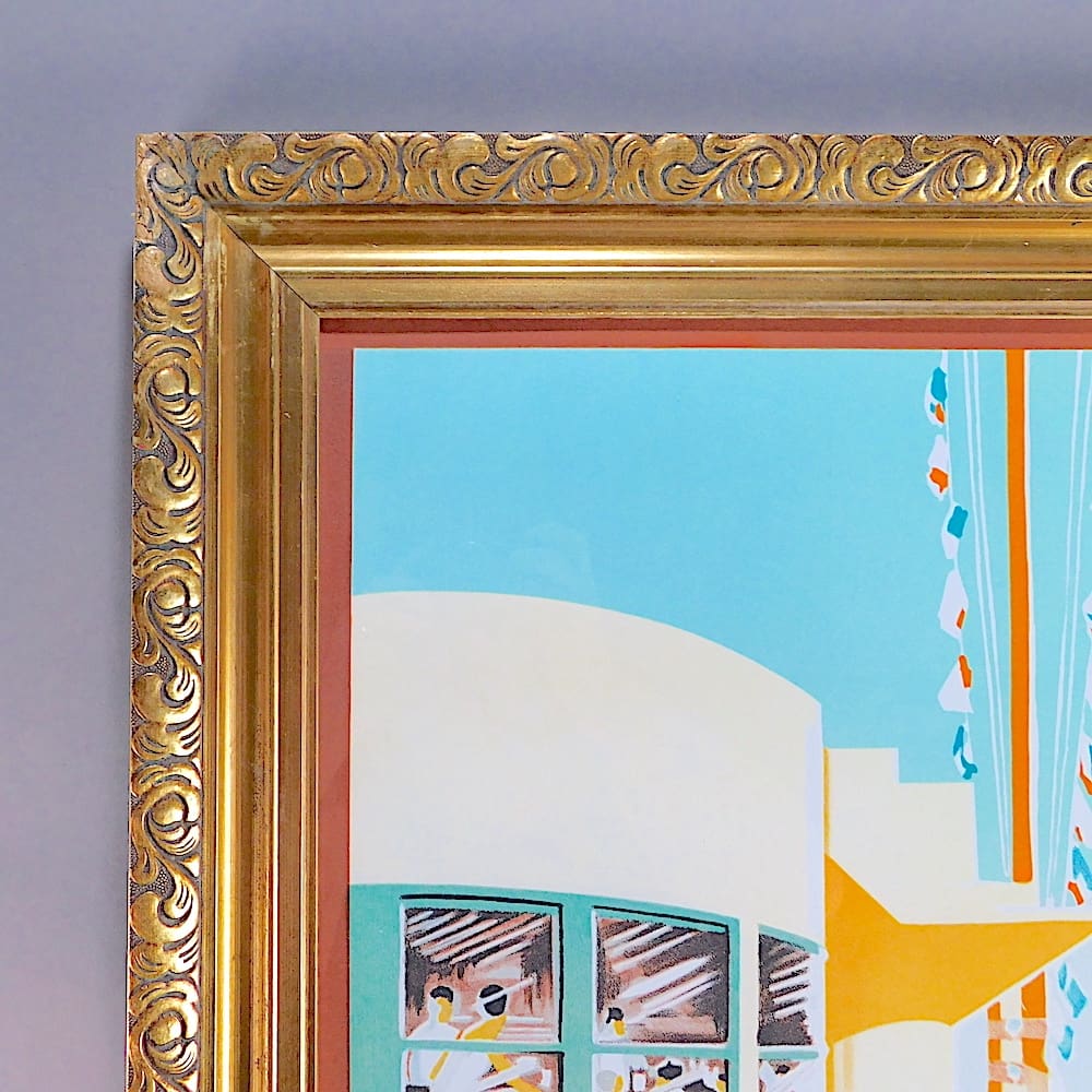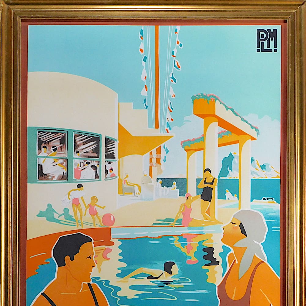 Reproduction print of a 1930’s French art deco beach scene poster for La Ciotat Plage, a costal region of south France equally distanced between Marseille and Toulon.