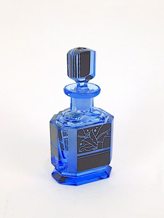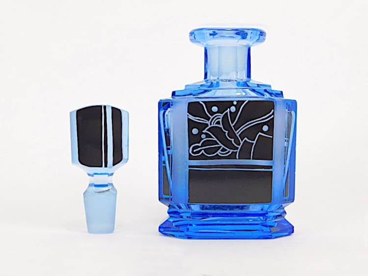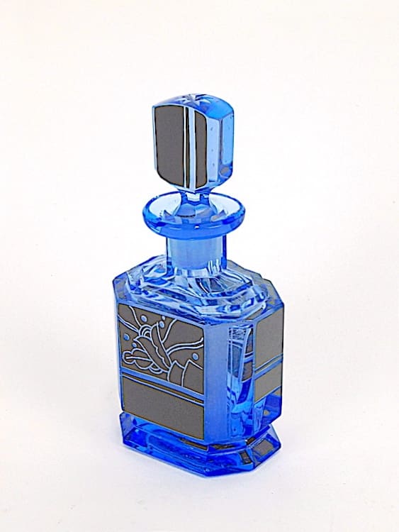 Czechoslovakian blue tinted glass with hand etched enamel patterning scent bottle.