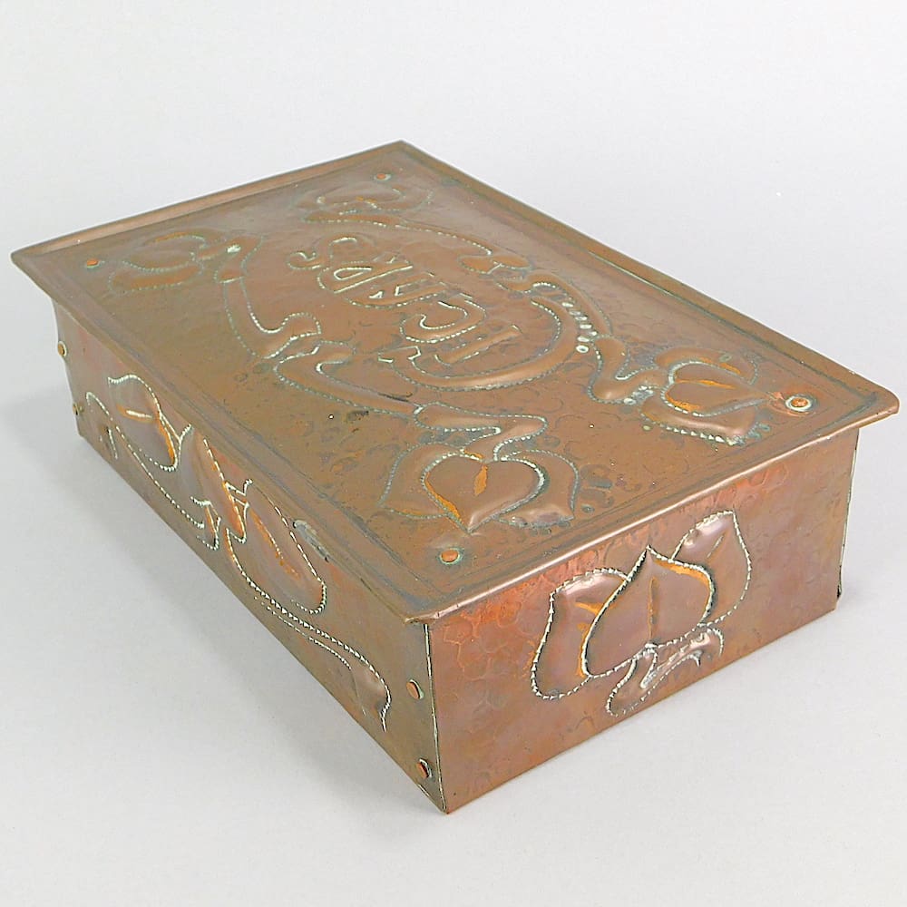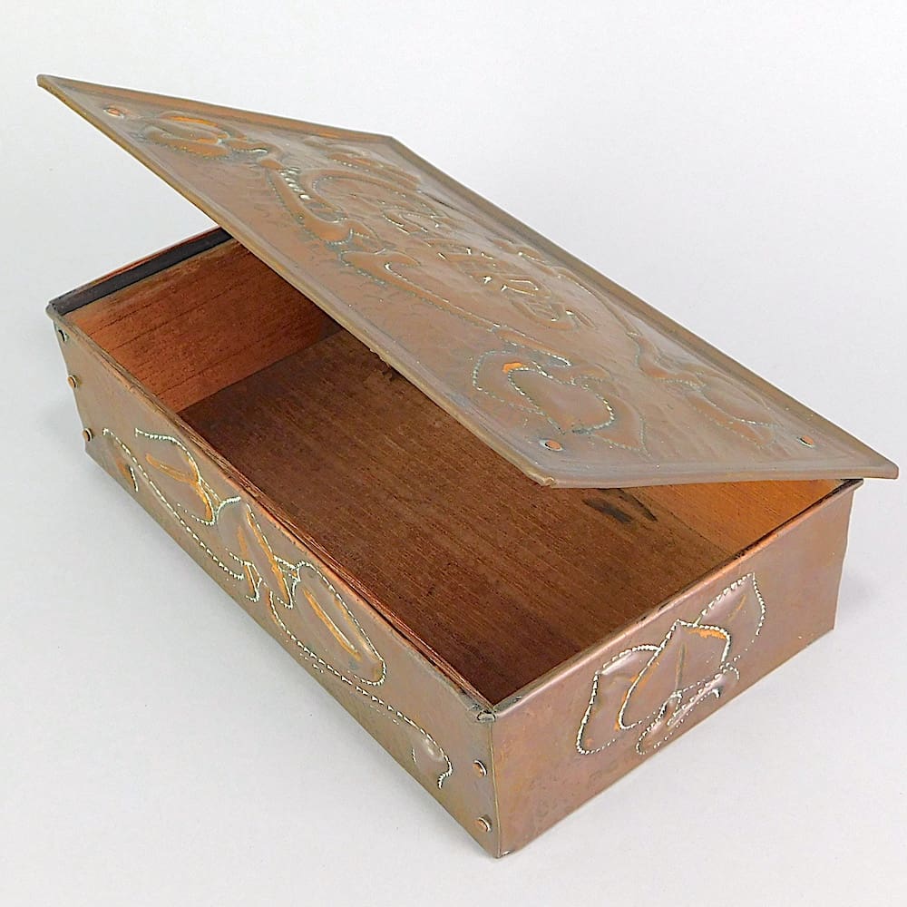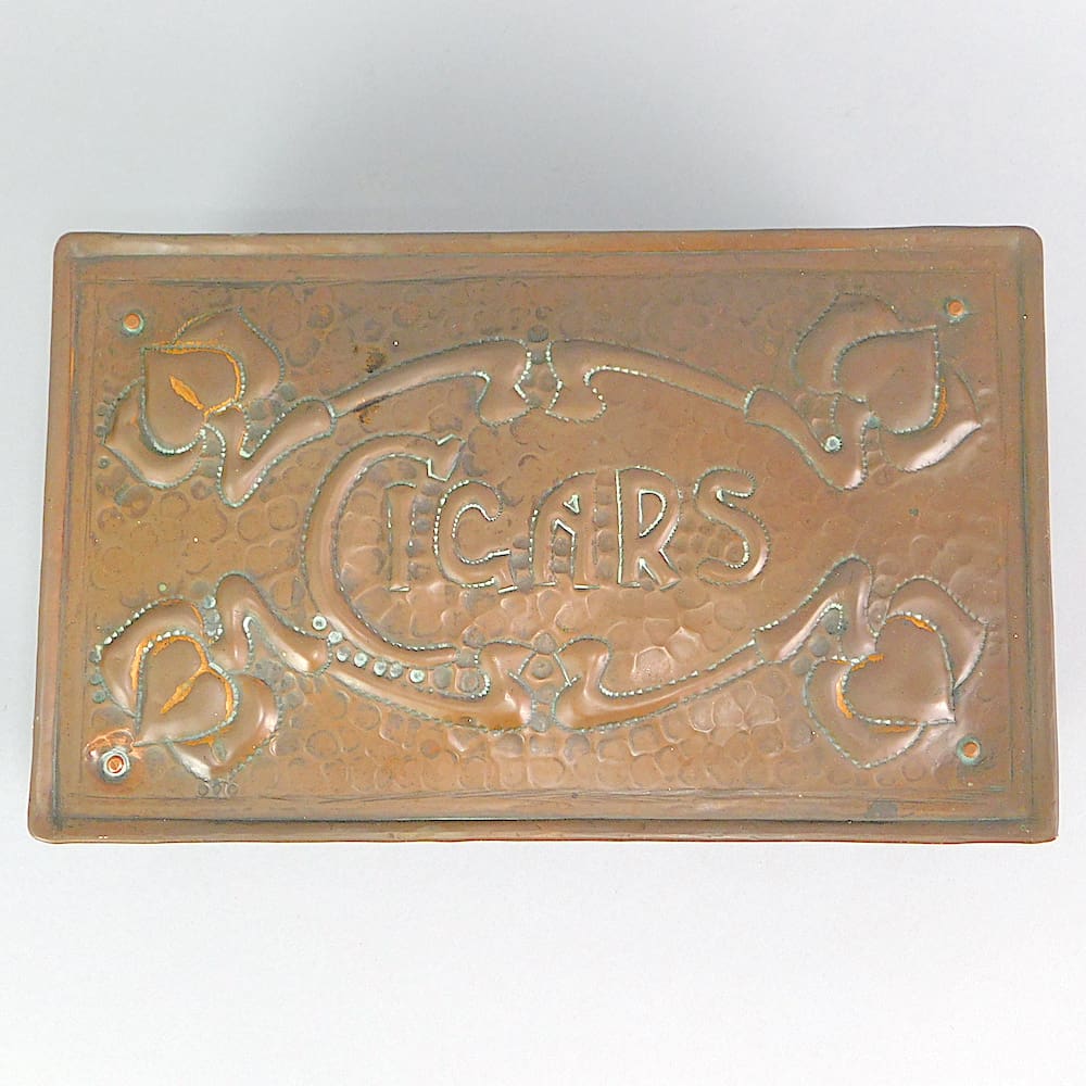 Cedar lined art nouveau copper cigar box with cigars written to the lid.