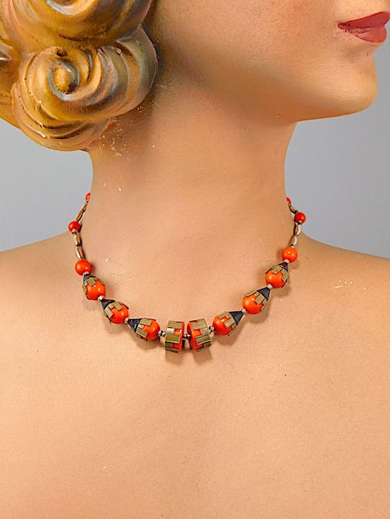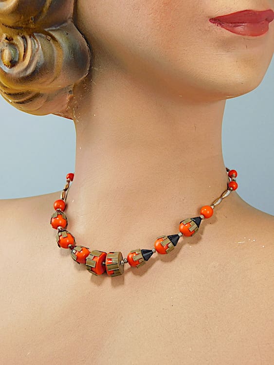 Vivid orange and black castellated glass necklace. Made in the late 1920s in Czechoslovakia.