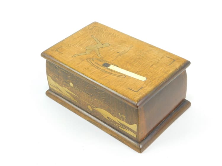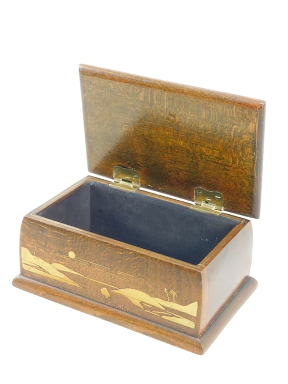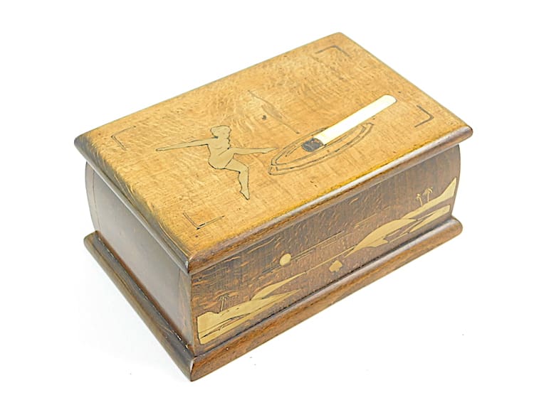 Beautifully made, quality curved wood box with a brass inlay panel of a dancing lady on the lid and an inlay of either ivory or celluloid cigarette. Desert scenes around the back panel.