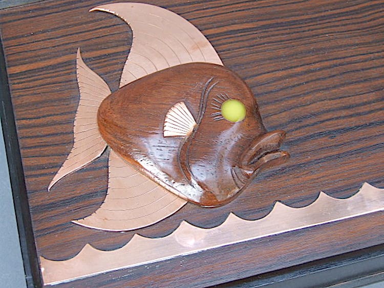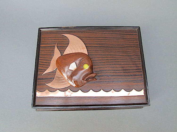 Large French macassar ebony box with fish lid. The fish is carved from wood and has a phenolic eye and copper metal tail and fins. There is also copper wave patterning below him. Unsigned but probably by Danharner.