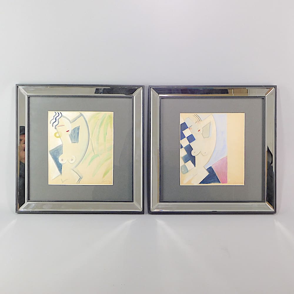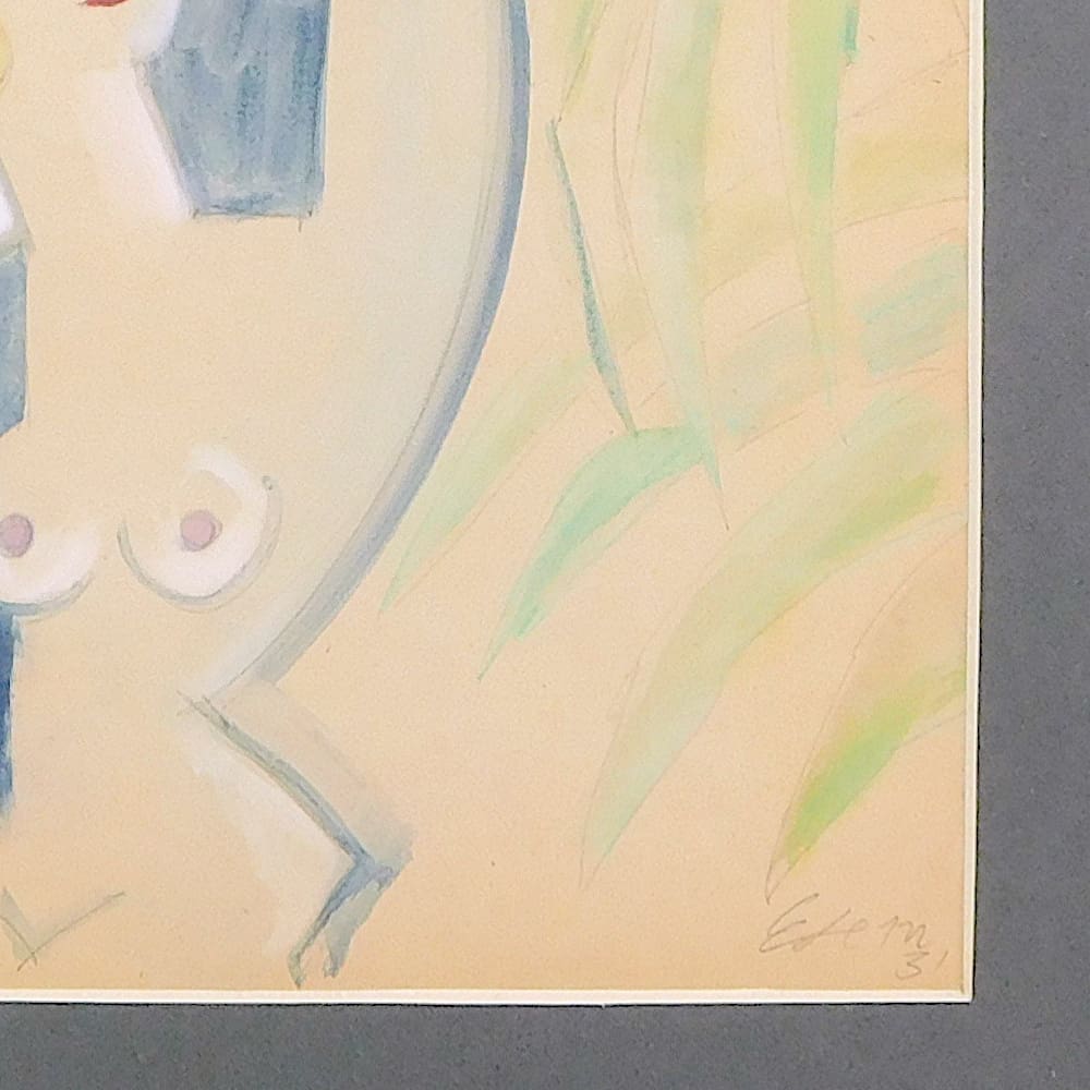 French art deco early 1930s cubist nude lady water colour painting by EHM.
