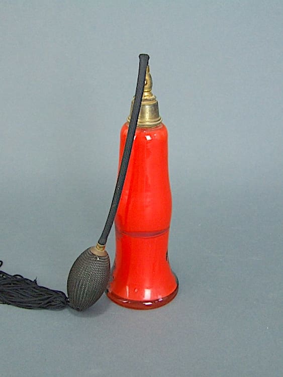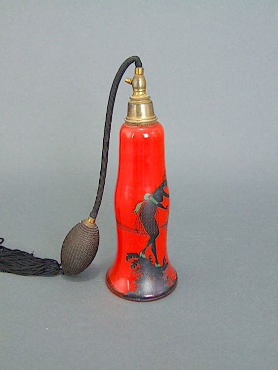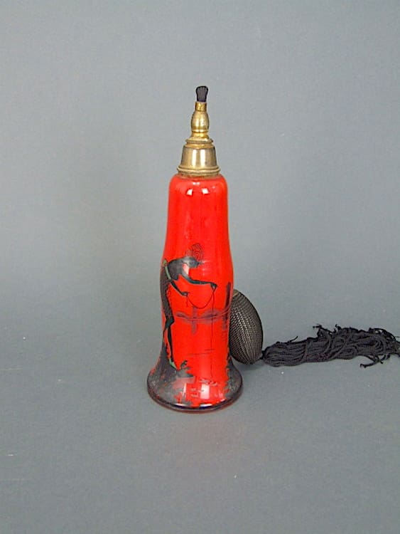 French red glass atomiser spray with hand painted lady fishing silhouette detail. Still retains its original puffer.