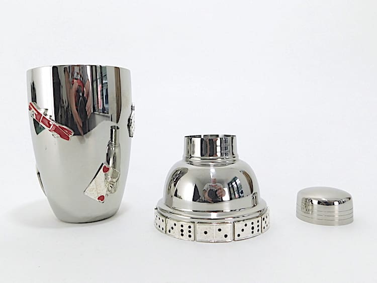 American vintage art deco Godinger cocktail shaker with dominoes, cards, dice, a Cadillac convertible, and a coin op machine attached to it.