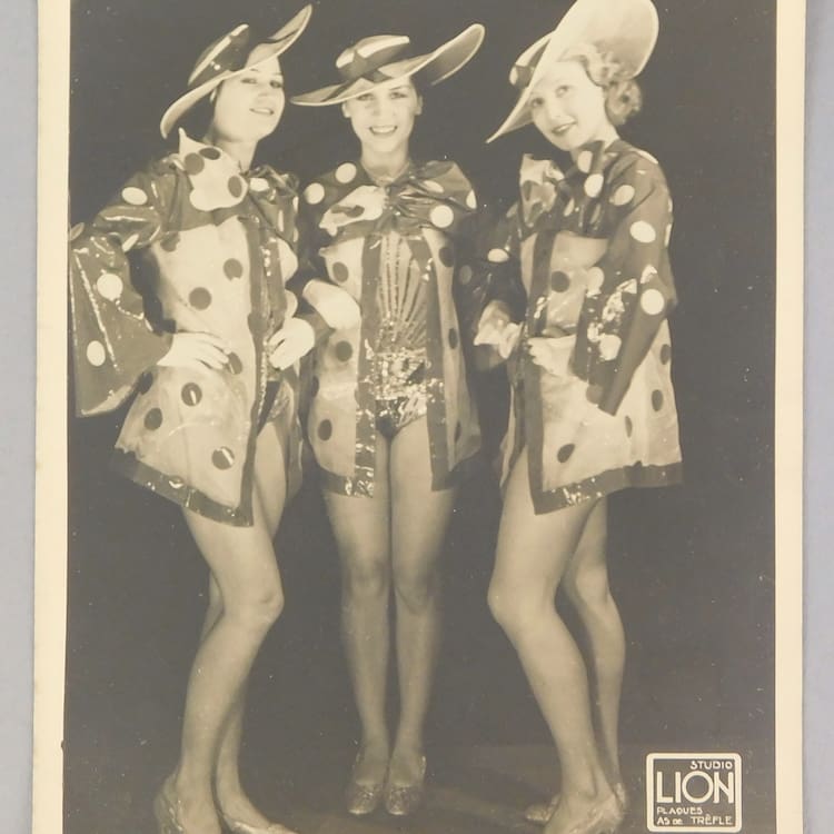 An original Folies Bergere photograph of a theatrical group of girls from the 1920s. This photo shows a group three ladies in see-through polka dot rain coats. It is stamped to the front Studio Lion. A genuine original art deco photo.