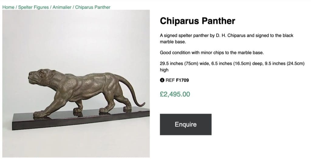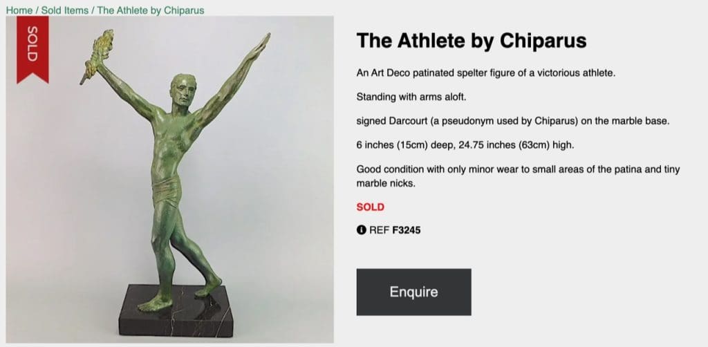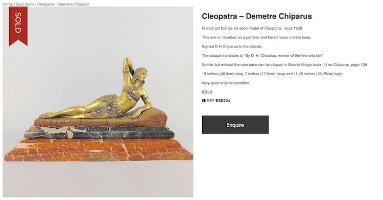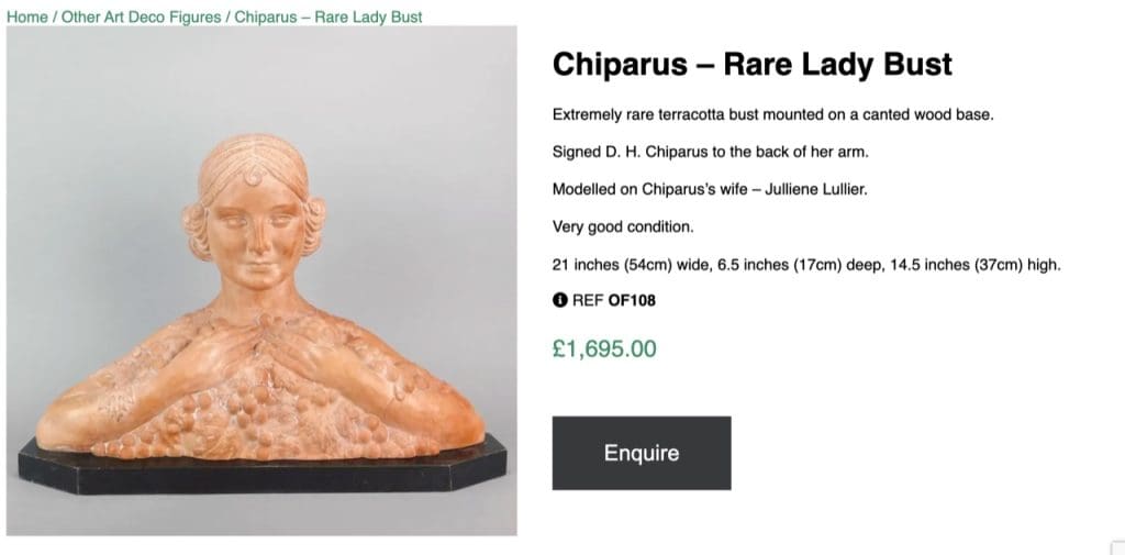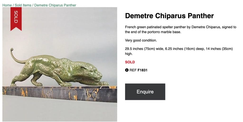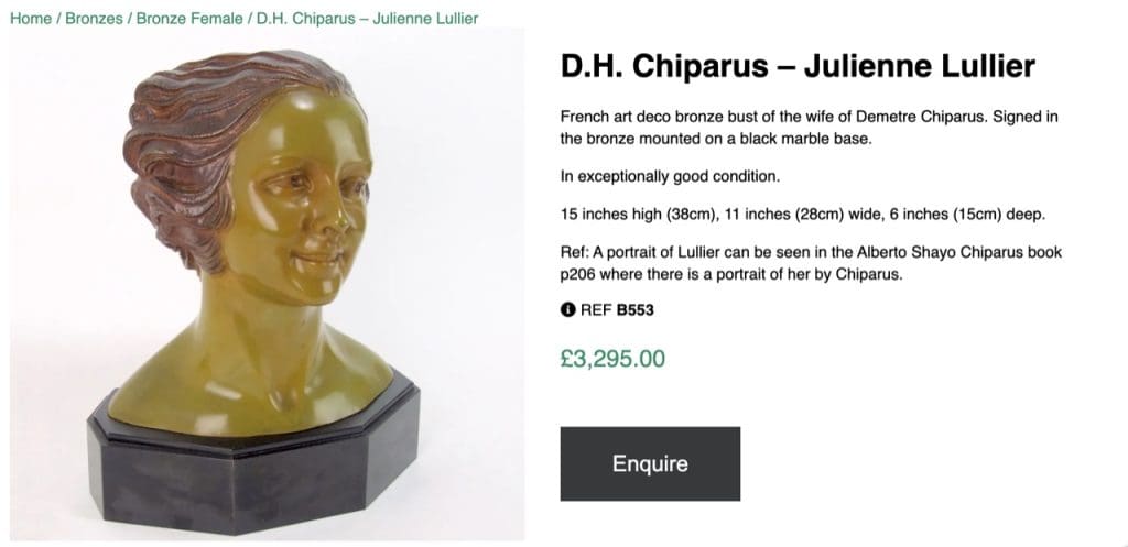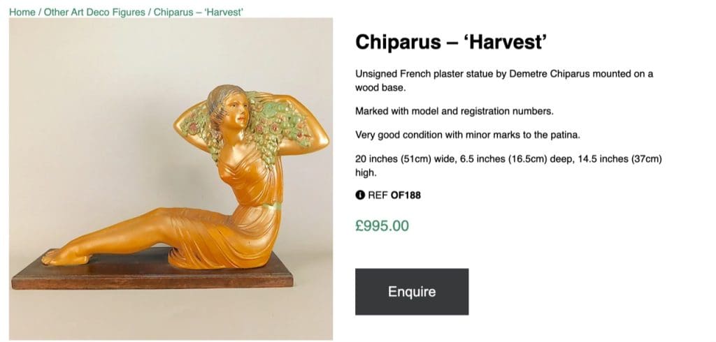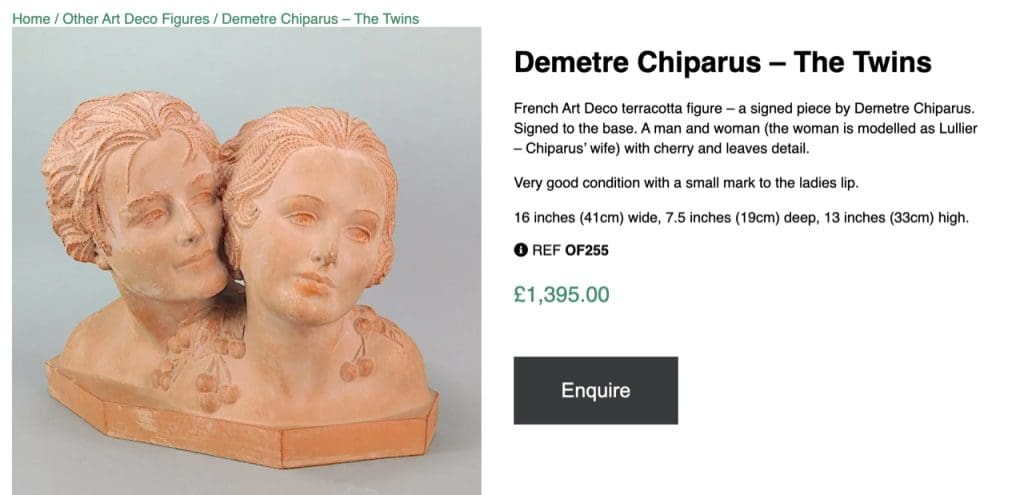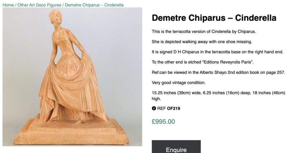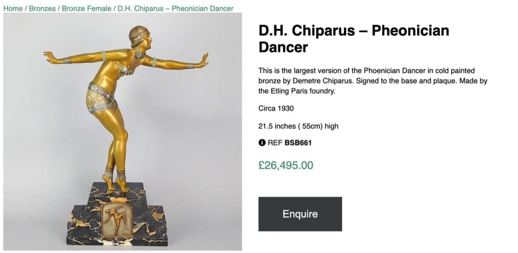 The artist would sell the modelled piece to the foundry (usually Etling and Les Neveux de J Lehmann foundry in the case of Chiparus bronzes and chryselephantines). They would pay the artist and often pay a commission on the amount they created. This I believe may be partly why so many Chiparus statues are unsigned; at this time it was not uncommon for statues to be made for retail outlets to sell – such as Primavera and Galleries Lafayette. The retailer would then put their own stickers on the statue wanting their buyers to believe the item was created by them. In the Shayo book Albert states that after interviewing Demetres widow that she stated “Demetre and I were not sure he got paid all the commissions he should have been paid”.