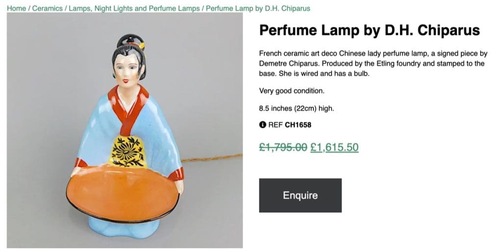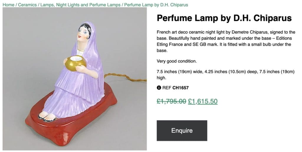 Famous performers such as the Dolly Sisters were also produced not only as metal statues but often as ceramic pieces. Most of Chiparus’ ceramic items were his bread and butter items and so he produced mainly night lights and vanity boxes as did many of the top artists at this time.