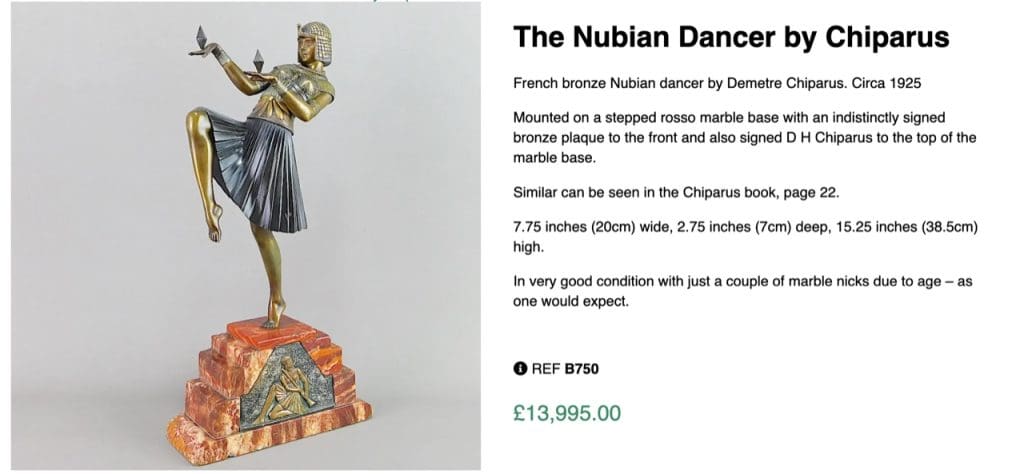On February 16, 1923, Tutankhamun’s tomb was opened by Howard Carter and Egyptology took the world by storm. This was Chiparus’s inspiration for many of his statues. Also at this time world travel was becoming available to the masses with air travel and boats becoming more affordable for everyone. So many other cultures became of interest to the affluent and art loving collectors of art deco statues.