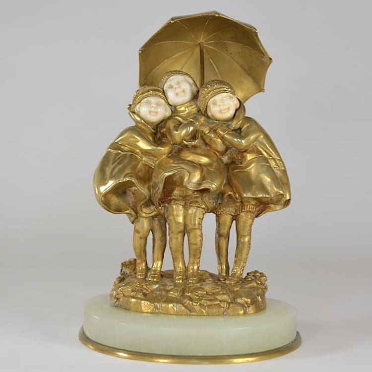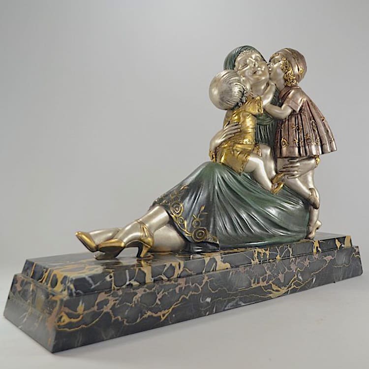 He made plaster, spelter and spelter and ivorene (a bakelite phenolic material made to emulate chryselephantines for the middle market), terracotta, full bronzes and his bronze and ivory statues know as chryselephantine. Chrysel being greek for bronze/gold and elephantine for ivory. Below is a shelter and ivorene group statue by Chiparus made to emulate a chryselephantine.