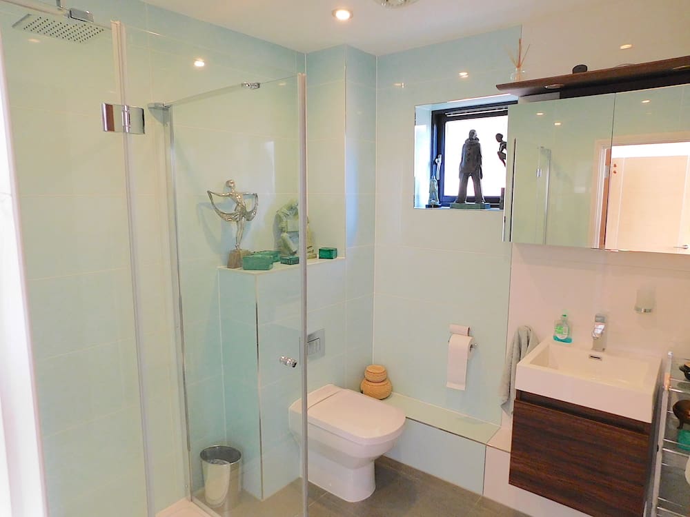 The smaller en-suite in green glass tiles also has a shower cubicle and single sink.