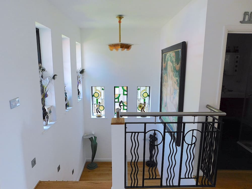 Access is to the top floor, walk into the spacious and well lit hallway and you will find 3 family bedrooms and a utility room all with engineered wooden flooring. There is also a family shower room which has grey slate tiles to the floor and white and red tiling on the walls. A solid oak staircase with a wrought iron Art Deco scrolled balcony railings overlook the first landing.