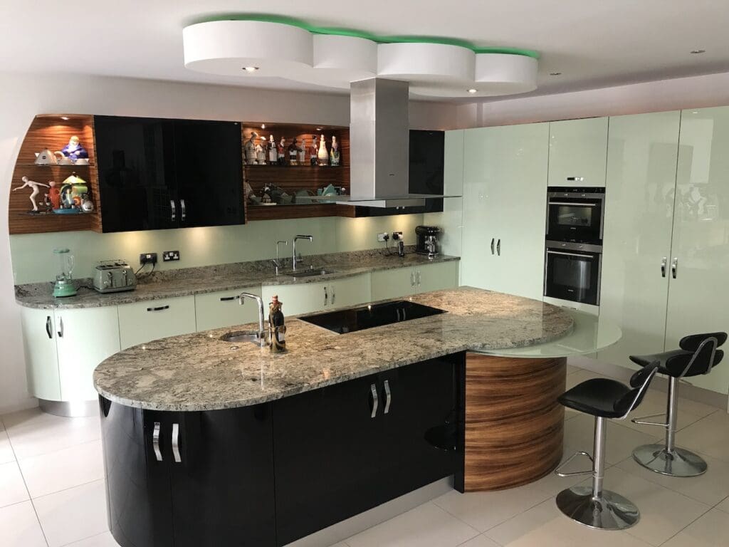 The central island measures 12 feet long with an integrated green glass breakfast bar and bar stalls to one end. The cupboards are made of high gloss parapan in pistachio green and black with contrasting zebrano wood detailing. Central prep sink to the island waste disposal and extractor and neon lit cloud detail above. Wall units also lit with neon lighting above. All Worktops are made from rare Namib marble with green and black striations and gold flecks. Appliances by Siemens with two electric ovens and a combination microwave. The hob is a 5 ring induction hob, integral full height fridge and separate full height freezer. A Quooker boiling tap and a separate filtered water option to the main tap.