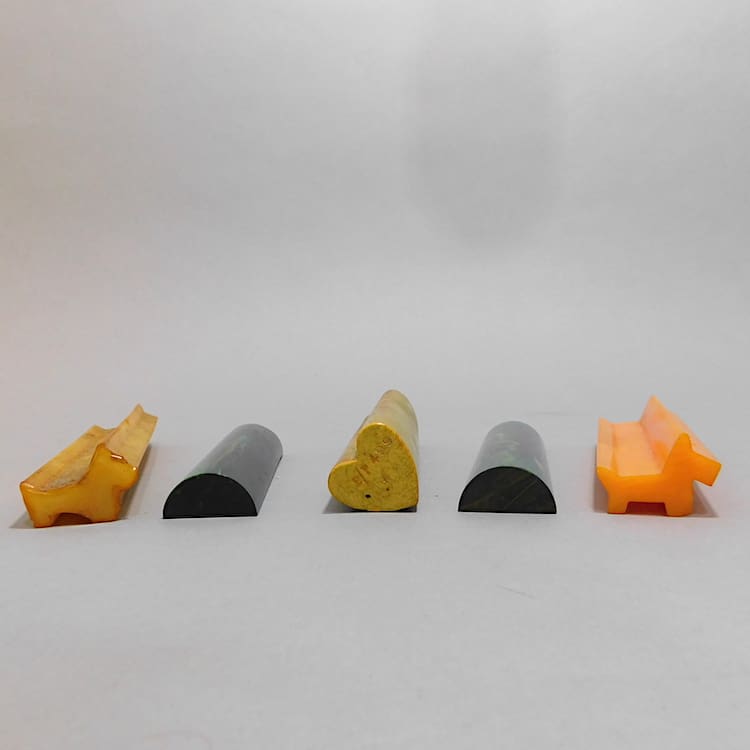A selection of original vintage galalith pieces in the authors private collection, showing two long versions of a scotty dog, a heart shape and a pair of marbled semi circles.