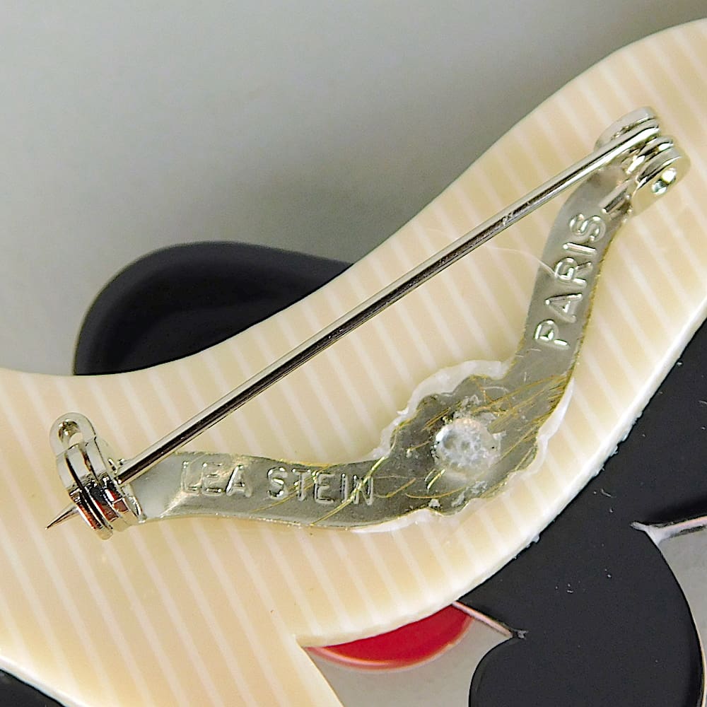 Lea Stein brooches are unique in style and Lea has been described as the most notable and innovative designer of plastic jewellery of the 20th century. Alongside her unique style of Brooch is the distinctive V shaped signed safety clasps to the reverse of her brooches which makes them so easily identifiable. Earlier versions of the clasp were not marked but most are impressed with “Lea Stein Paris”. Some of the smaller brooches like her waistcoat design have smaller straight clasps which also are impressed with “Lea Stein” with no room offered for Paris. We have seen examples of real Lea Stein brooches without the V clasps which could be attributed to the original clasp becoming detached and a different clasp added. While this will take away from the originality of the piece, they are unmistakably Lea Stein brooches.