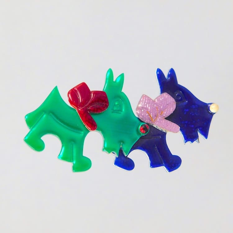 Vast design varieties can also be noted in her Dog, Cat and Fox brooches. In fact Ric the terrier was inspired by “Ric and Rac, the naughty terriers” after the French cartoon series by Pol Rab which dates back to the 1920s. The inspiration for Plouc and Ploukie, I believe were modelled after her own dogs.