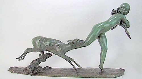 He executed two major commissions for the 1937 Paris International Exhibition. He is perhaps best known for his bronze figures, but he also produced statues in bronze and ivory (chryselaphantine) and ceramics. Many statues having a classical theme – like Pan, Satyrs, Diana the Huntress or his famous Amazonian Diana with shield and spear.