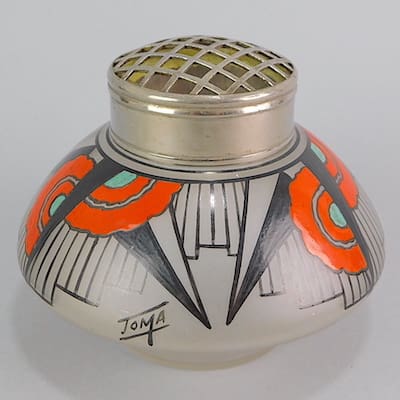 A French glass factory, dates unknown, but they were definitely very busy during the 1920’s – 1930’s. It was during these years that the many hand painted enamel vases and other items were produced. Mostly in bright Deco geometric or floral designs.