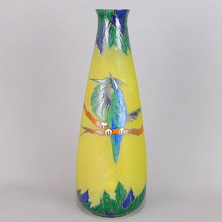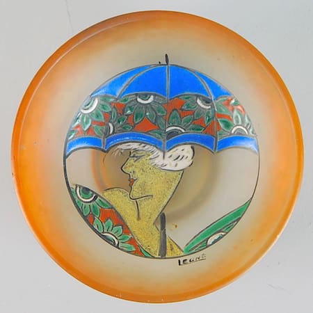 The Leune studios were situated in Paris, France and produced lots of art deco items in the 1920’s and 1930’s. The studio director was Auguste Heiligeinstein, and the glass was made by Daum in Nancy or Croismare and supplied to the Leune artisans who hand decorated them. Pieces were of the same period, style and quality as Daum, Muller, Schneider, Degue and Noverdy.
