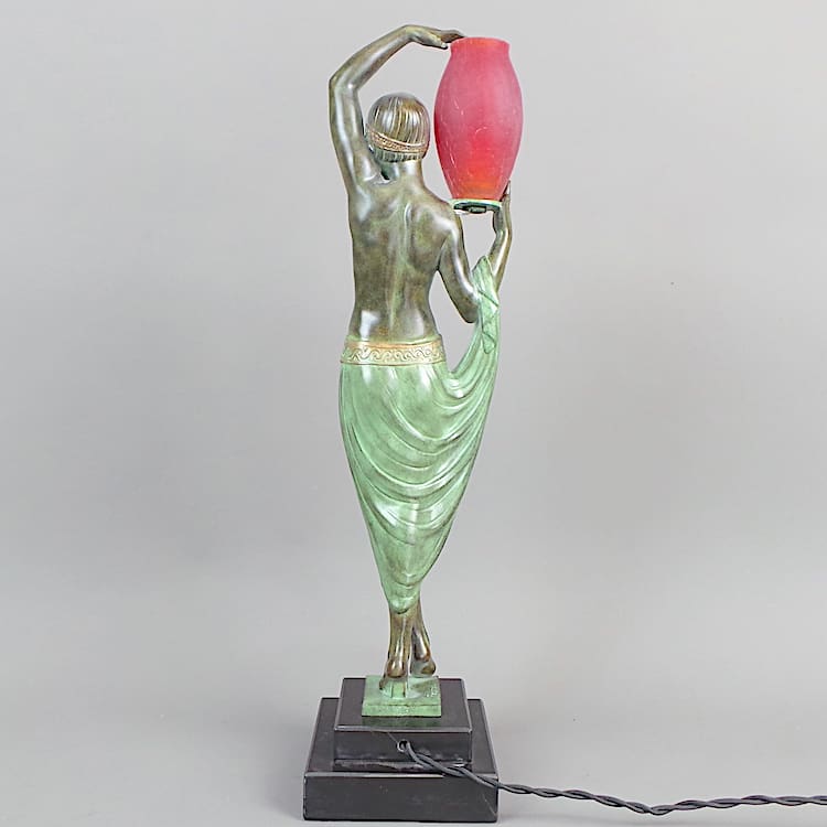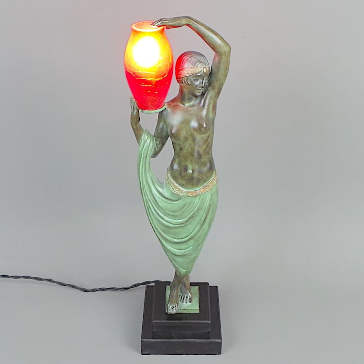 French Art Deco art metal lady mood lamp. She is holding a frosted red glass urn lamp.
