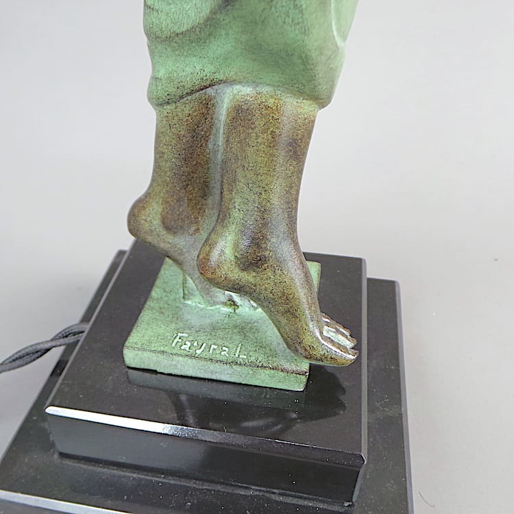 Her title is Odalisque and she was made by the Le Verrier foundry and designed by Pierre Le Faguays and signed in his pseudonym Fayral. Also bears the Le Verrier foundry stamp to the metal socle base.