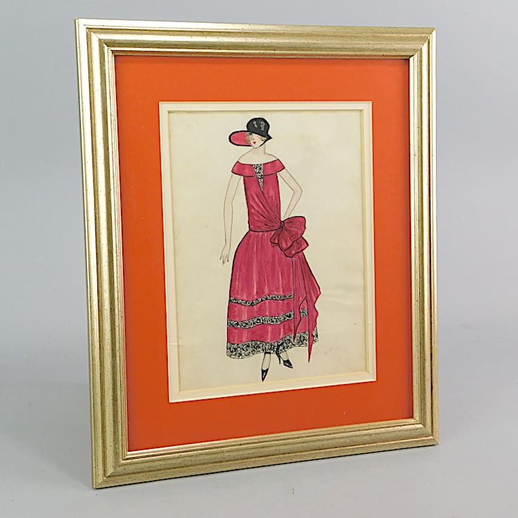 Fashion watercolour picture of a lovely lady in pink flapper dress, painted in the 1920s by Dorothy Warman and initialled. Framed in a contemporary gilded wood frame. Frame is surface or wall mounted.