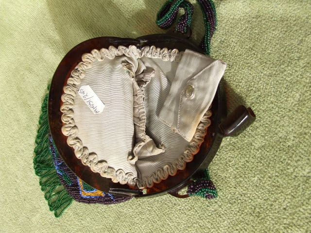 Wonderful 1930’s flapper girl hand bag – an original French beaded evening bag. Predominantly purple with celluloid tortoiseshell top section and clasp with beaded handle. Inside is made of grey silk with an inner pocket and matching tiny purse.