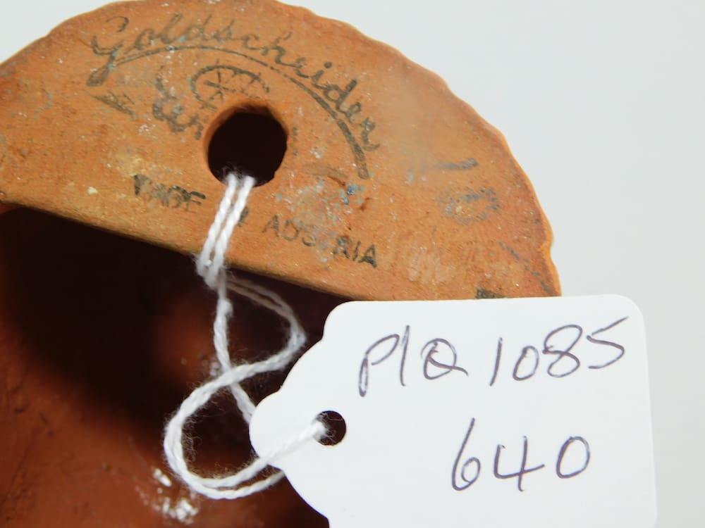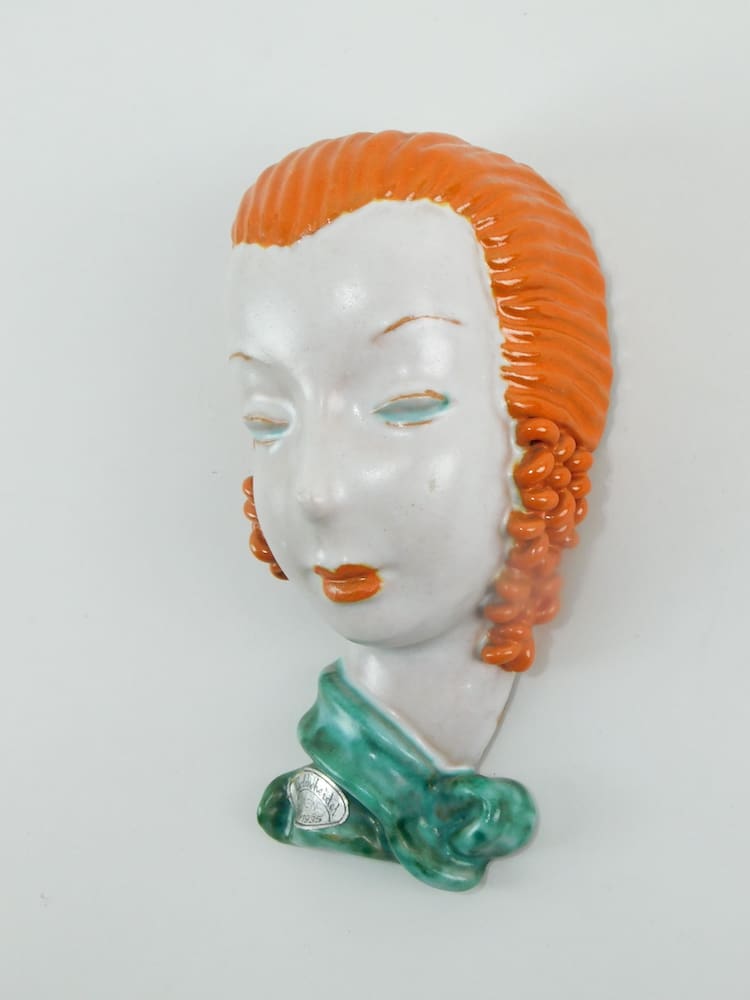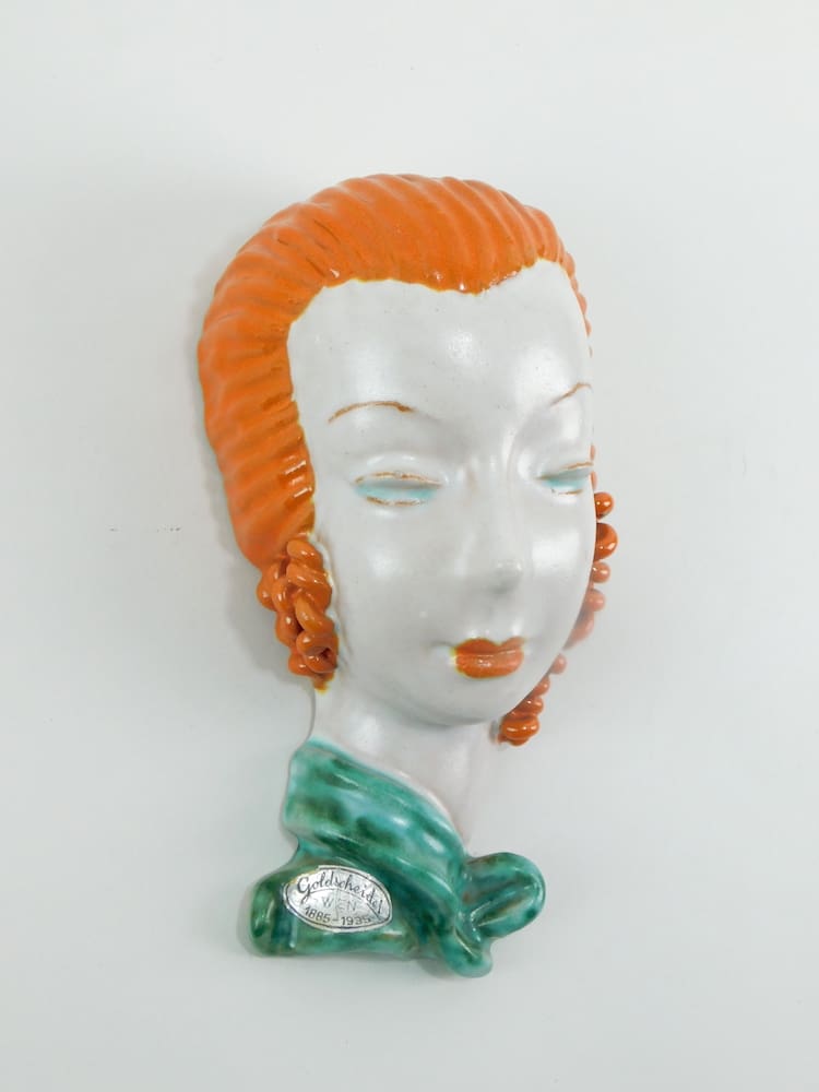 Austrian terracotta mask made in 1934 and marked to the reverse model number 6871, Goldscheider, Wien. Made in Austria. Retains its original label to her scarf.