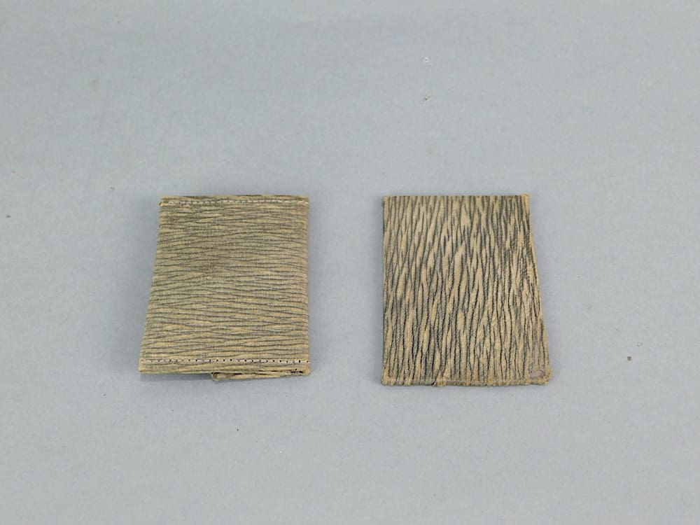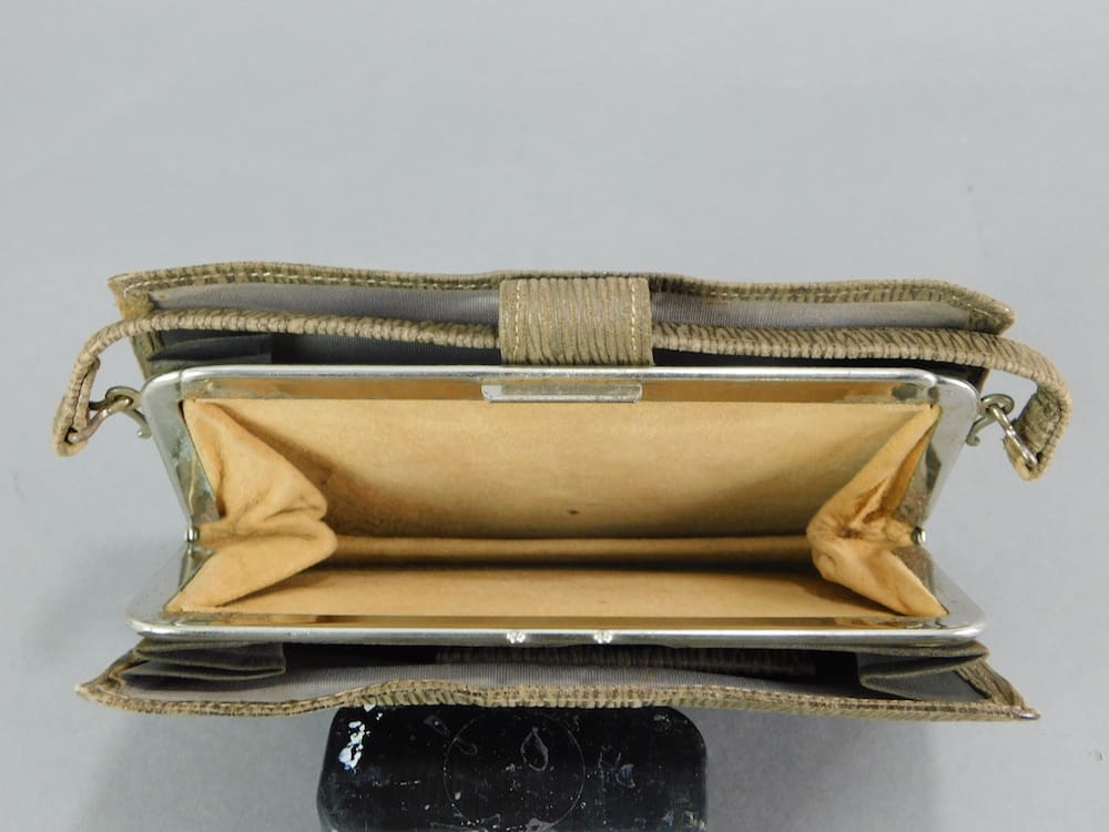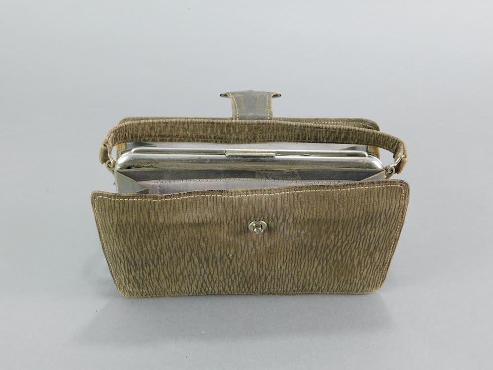 A brown ribbed leather small handbag with 3 compartments and there is a matching mirror and mini purse for your coins.