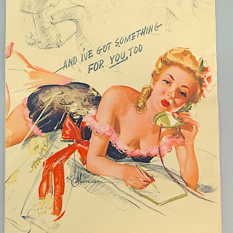An original American 1945 calendar page. Designed by Knute Munson, one of the famous pin up artists and titled – and I’ve got something for you, too. It is a December page. Item is sold Unframed.