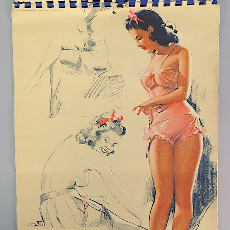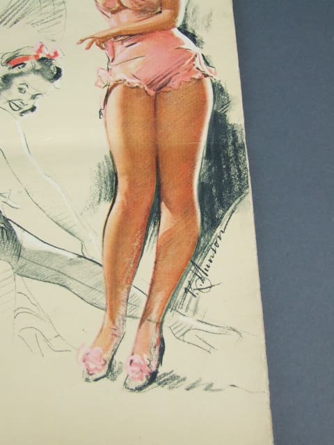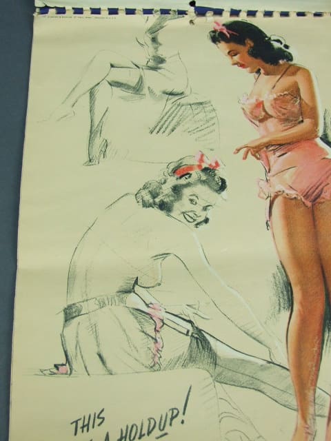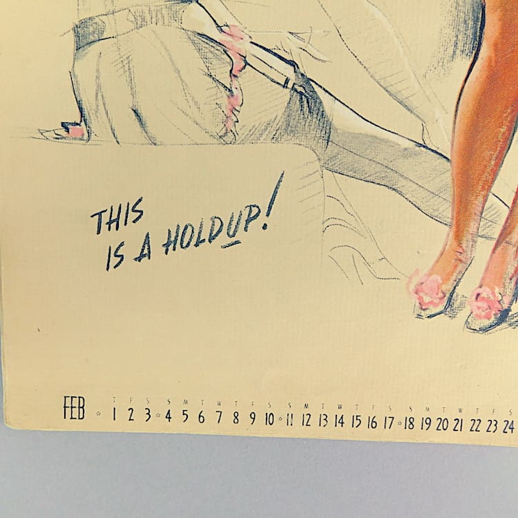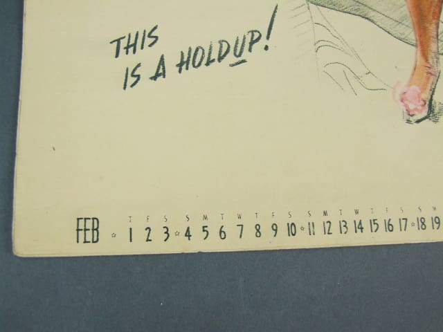An original American 1945 calendar page. Designed by Knute Munson, one of the famous pin up artists and titled – its a hold up. It is a February page. Item is sold Unframed.