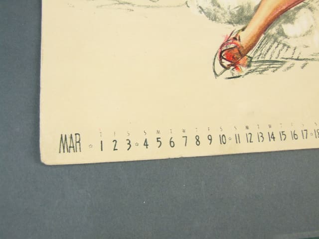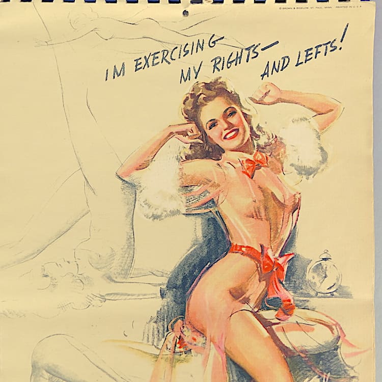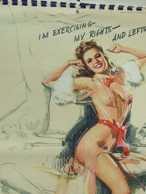 An original American 1945 calendar page. Designed by Knute Munson, one of the famous pin up artists and titled – Im exercising my rights, and lefts. It is a March page. Item is sold Unframed.