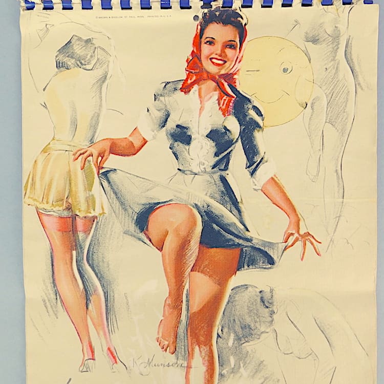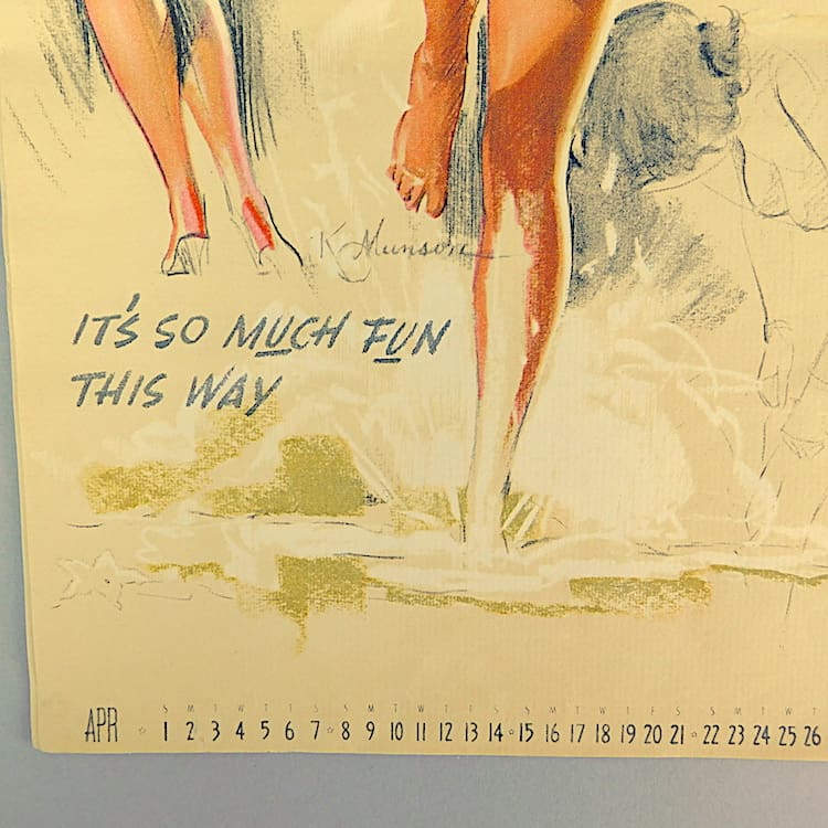 An original American 1945 calendar page. Designed by Knute Munson, one of the famous pin up artists and titled – it’s so much fun this way. It is a April page. Item is sold Unframed.