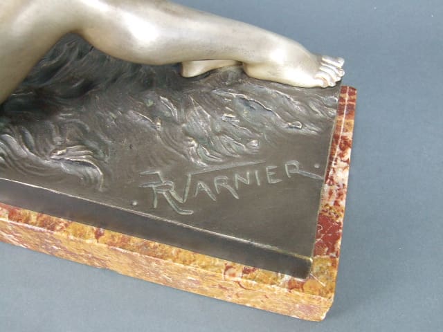 A signed silvered bronze art deco nude girl with love birds. Mounted on a red marble base.