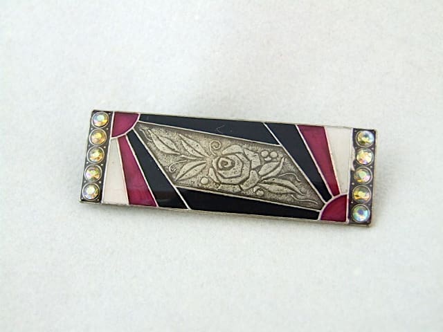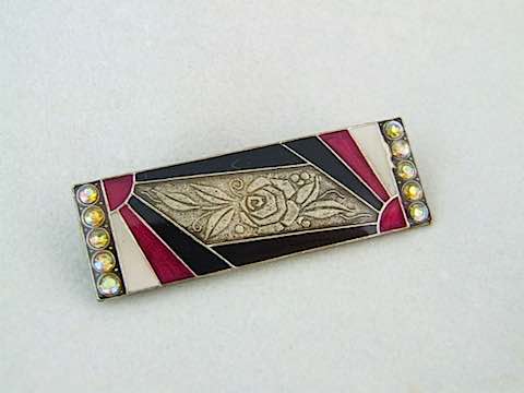 French art deco enamel brooch with sun ray detail and central stylised flower.
