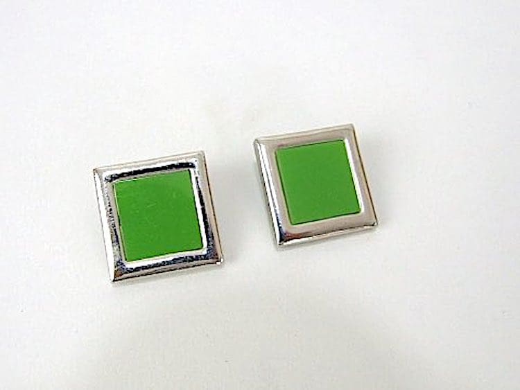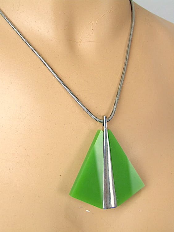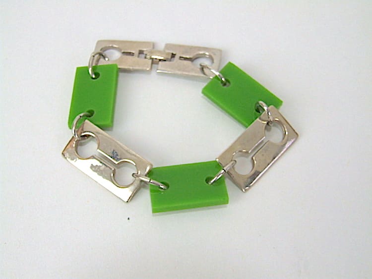 Green celluloid and chrome set consisting of necklace, bracelet and clip-on earrings. Marked Celebrity and probably made in the 1960s.