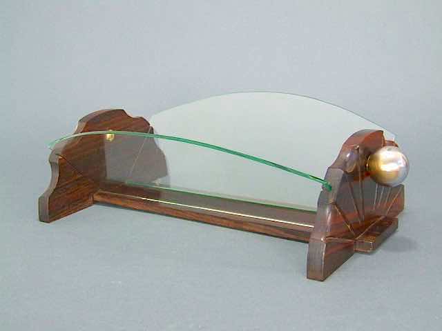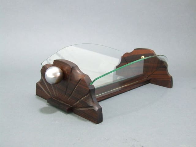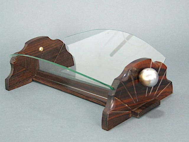 French modernist oblong fruit dish, with macassar wooden fan detail to the ends and shaped glass sides. Probably by Ravinet and Denfert.