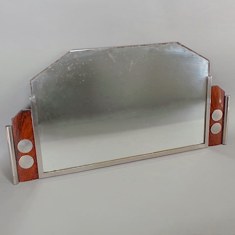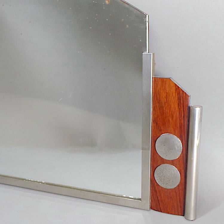 A French chrome and wood mirror which has chrome tube ends with chrome circles inserted into the wood panels.