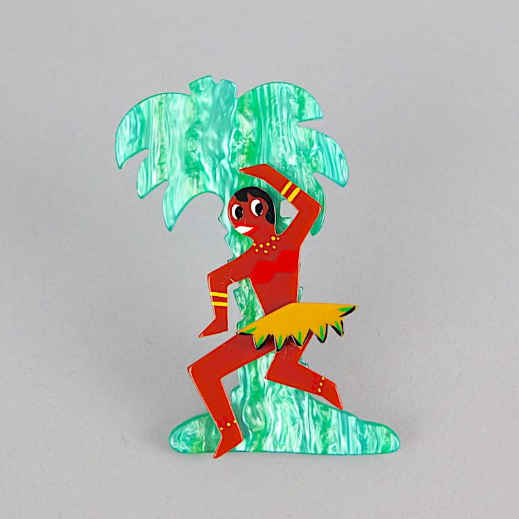 Hand painted phenolic brooch of Josephine Baker dancing her Banana Dance under a palm tree. Made by Marie-Christine Pavone and signed to the back. Fitted with a roll safety clasp.