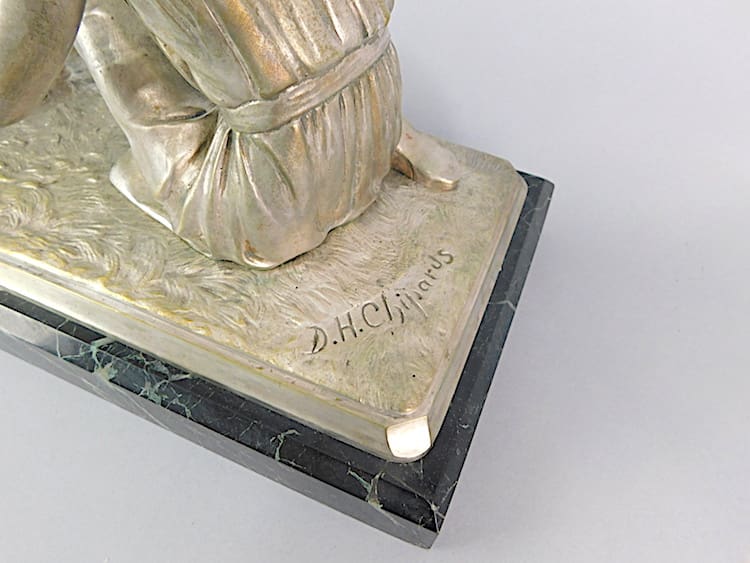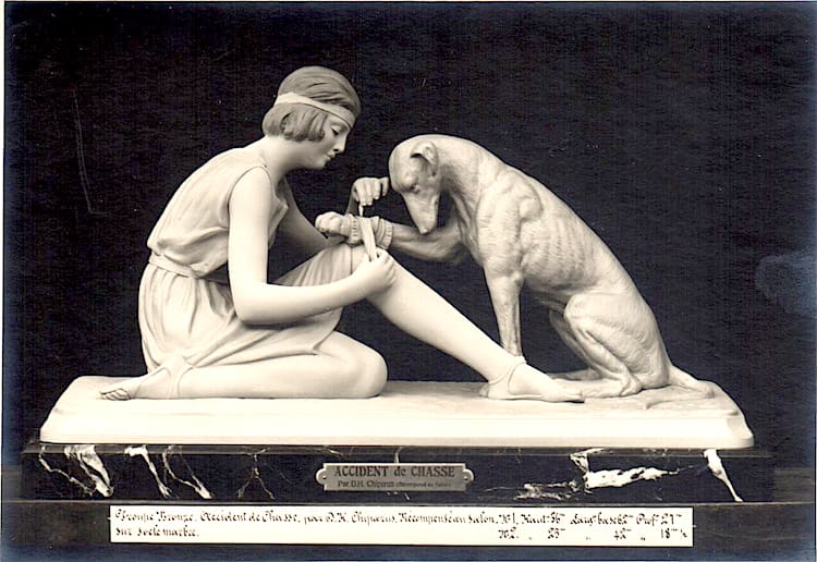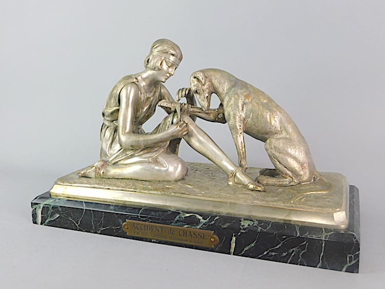 Demetre Chiparus (1886-1947). ‘Accident De Chasse’ an Art Deco Silvered and patinated 1925 bronze Study, cast as a seated Diane attending to her canine companion, on green virdigris marble base. Original plate on the marble “Accident de Chasse. Par DH Chiparus (récompensé au salon)”. Signed in bronze – D.H Chiparus.