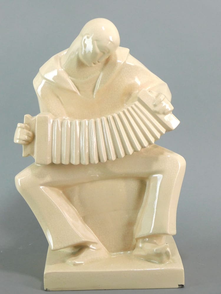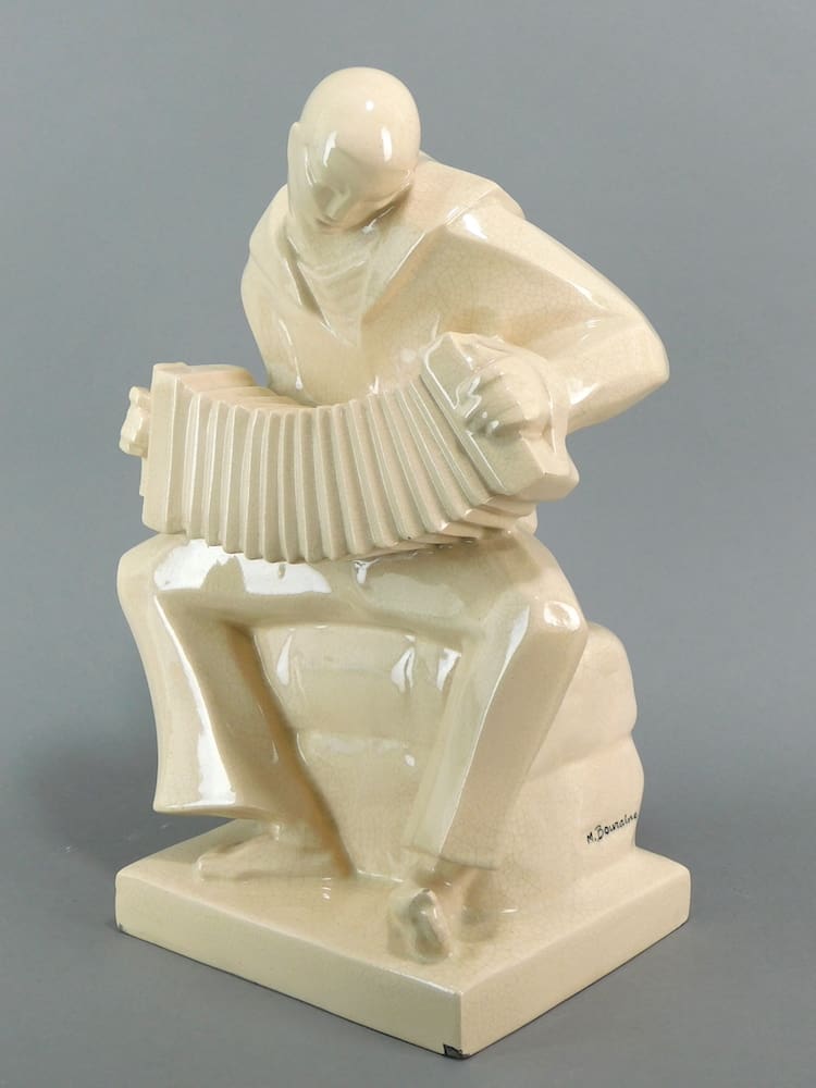 White terracotta with crackle glaze sailor accordion player signed M. Bouraine to the base.