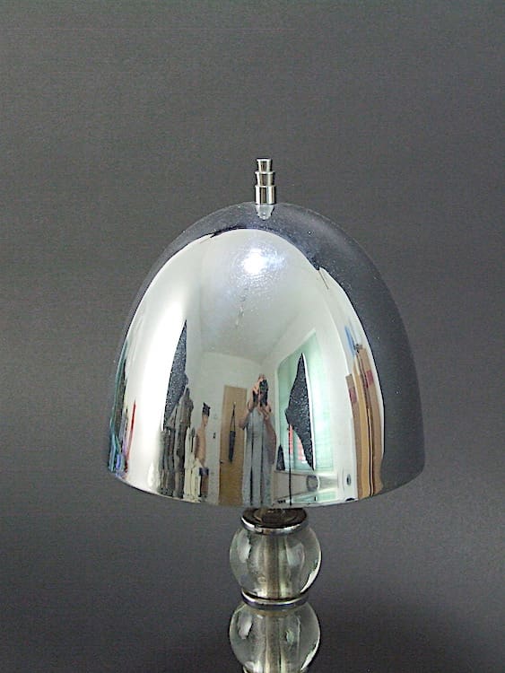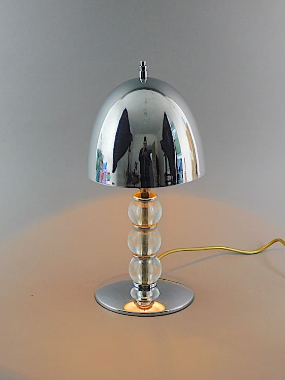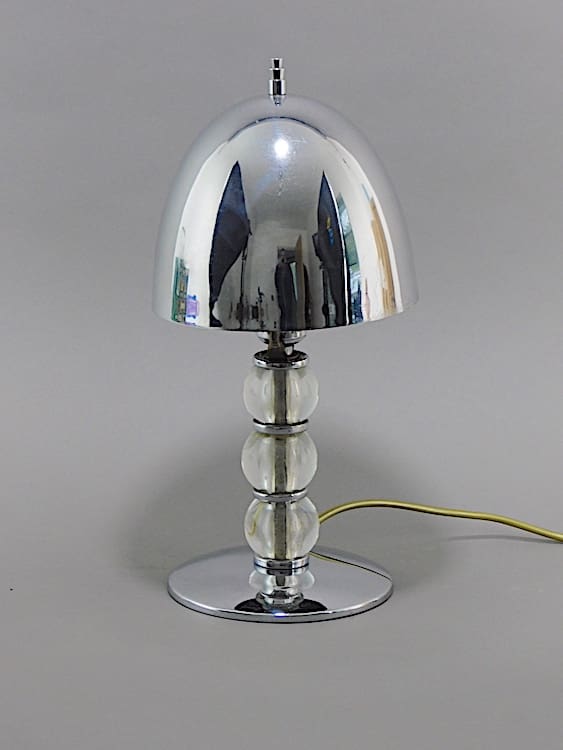 French art deco modernist Adnet style table lamp. Unsigned, but I have seen this lamp in an old catalogue. Chromed metal base with central column of stacked glass balls with a domed chrome metal shade.