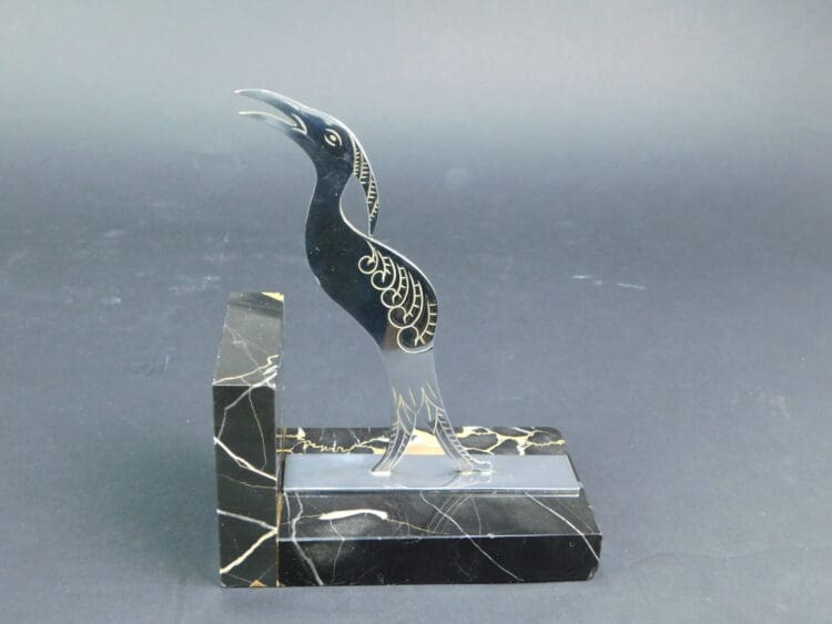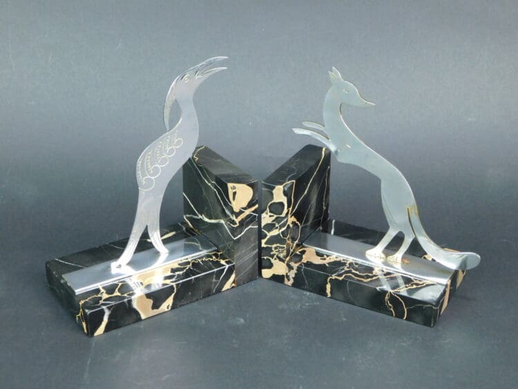 Modernist French art deco chromed bronze bird and fox, Aesops fable bookends.