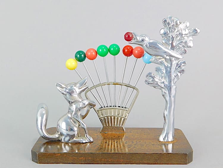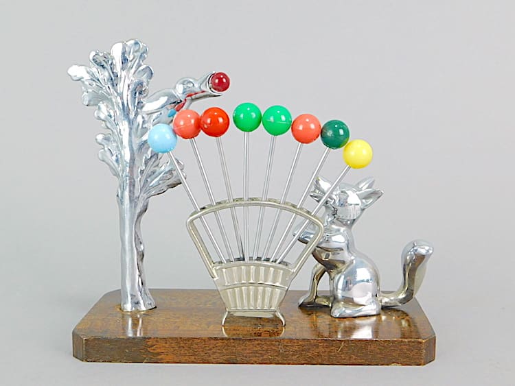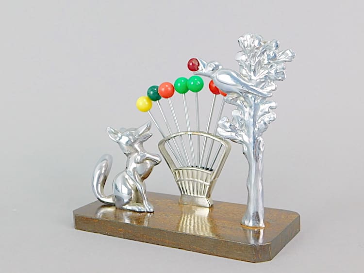 French art deco chromed metal cocktail sticks set. Modelled as the Aesops fable fox, bird and the cheese and designed by Benjamin Rabier. There are 8 cocktail sticks with it.