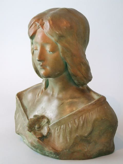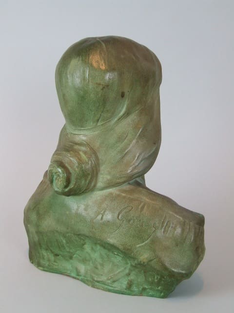 A green glazed terracotta art nouveau bust of a maiden with a star in her headband. Signed A. Gory to the reverse.