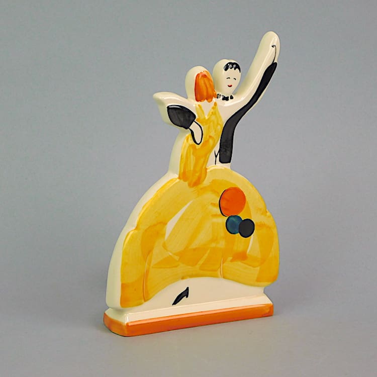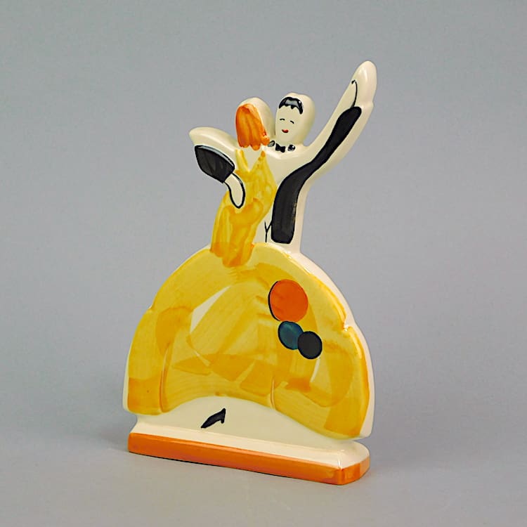 Art deco Clarice Cliff style hand painted age of jazz figure showing a dancing couple. Marked under the base made in England, these figures were produced by Past Times.