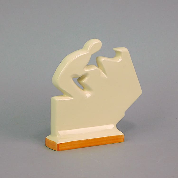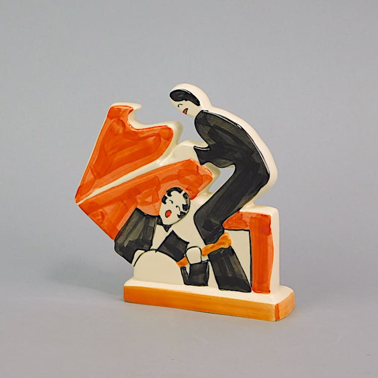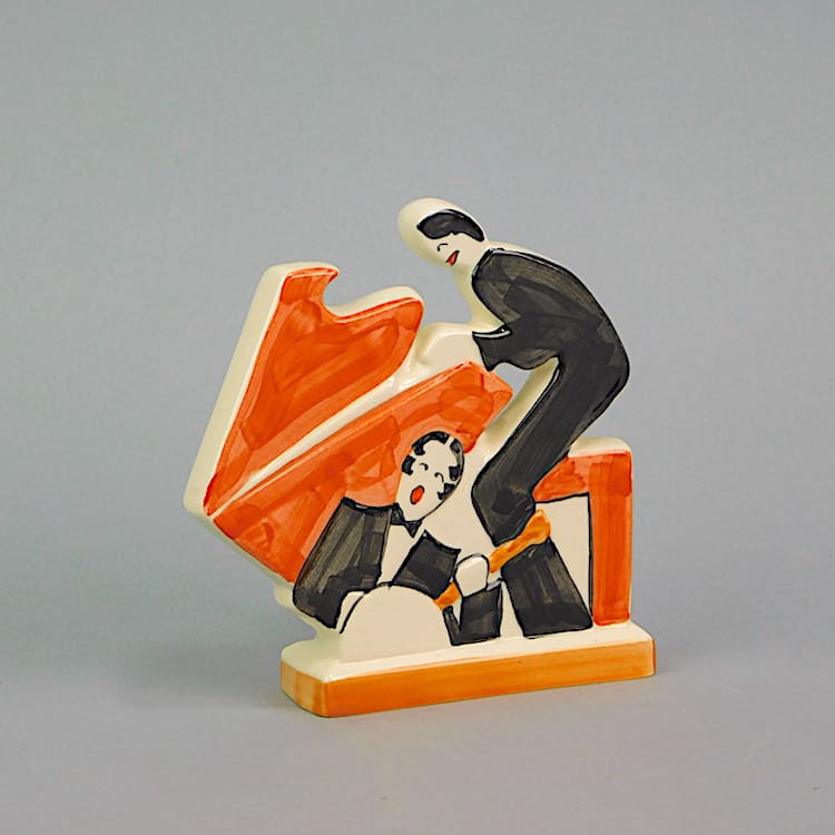 Art deco Clarice Cliff style hand painted age of jazz figure showing a pianist and banjo player. Marked under the base made in England, these figures were produced by Past Times.
