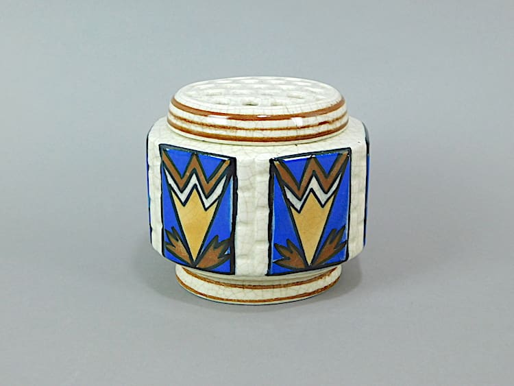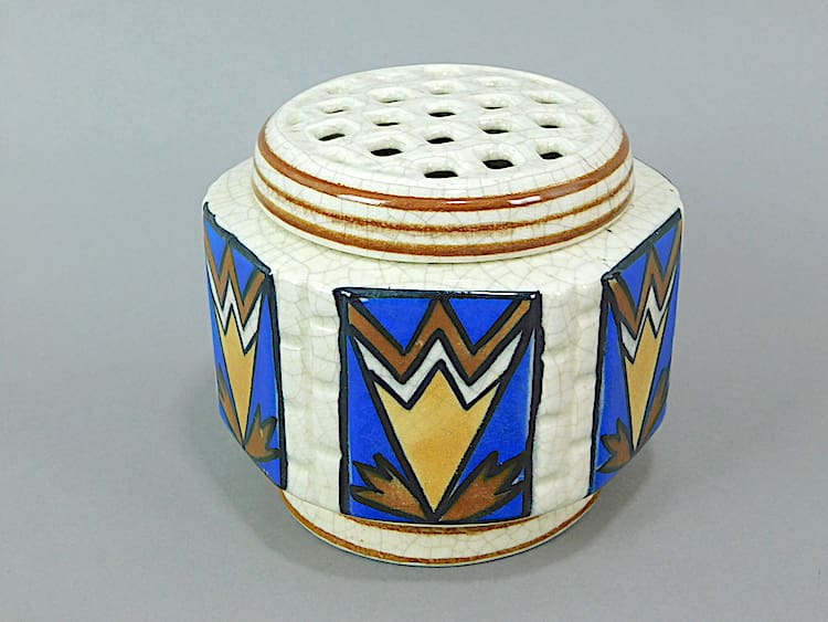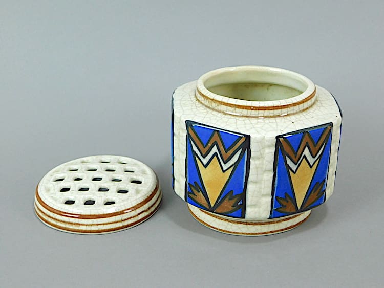 Hand painted in bright coloured enamel paint – this posy vase was made in Belgium by AMC and is stamped to the base. Perforated lid removes for cleaning.