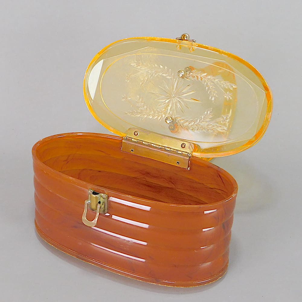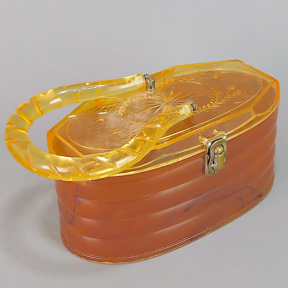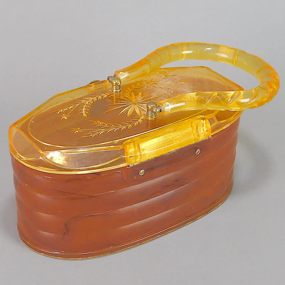 An American amber lucite handbag with beehive type ribbing and ovular form. The lid has a bevelled edge and floral patterning. Maker is probably Llewellyn and it was made around 1951.
