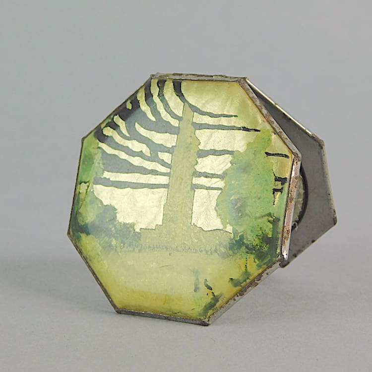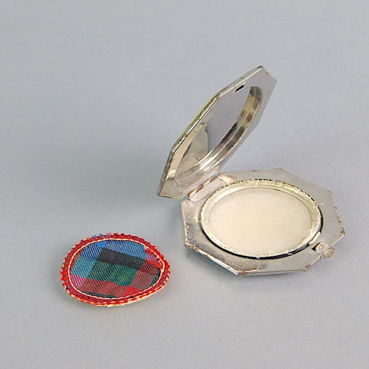 An octagonal compact depicting The Chicago Worlds Fair in 1933. A phonelic lid with the picture on a metal frame. Inside is the original powder puff and reflective lid.